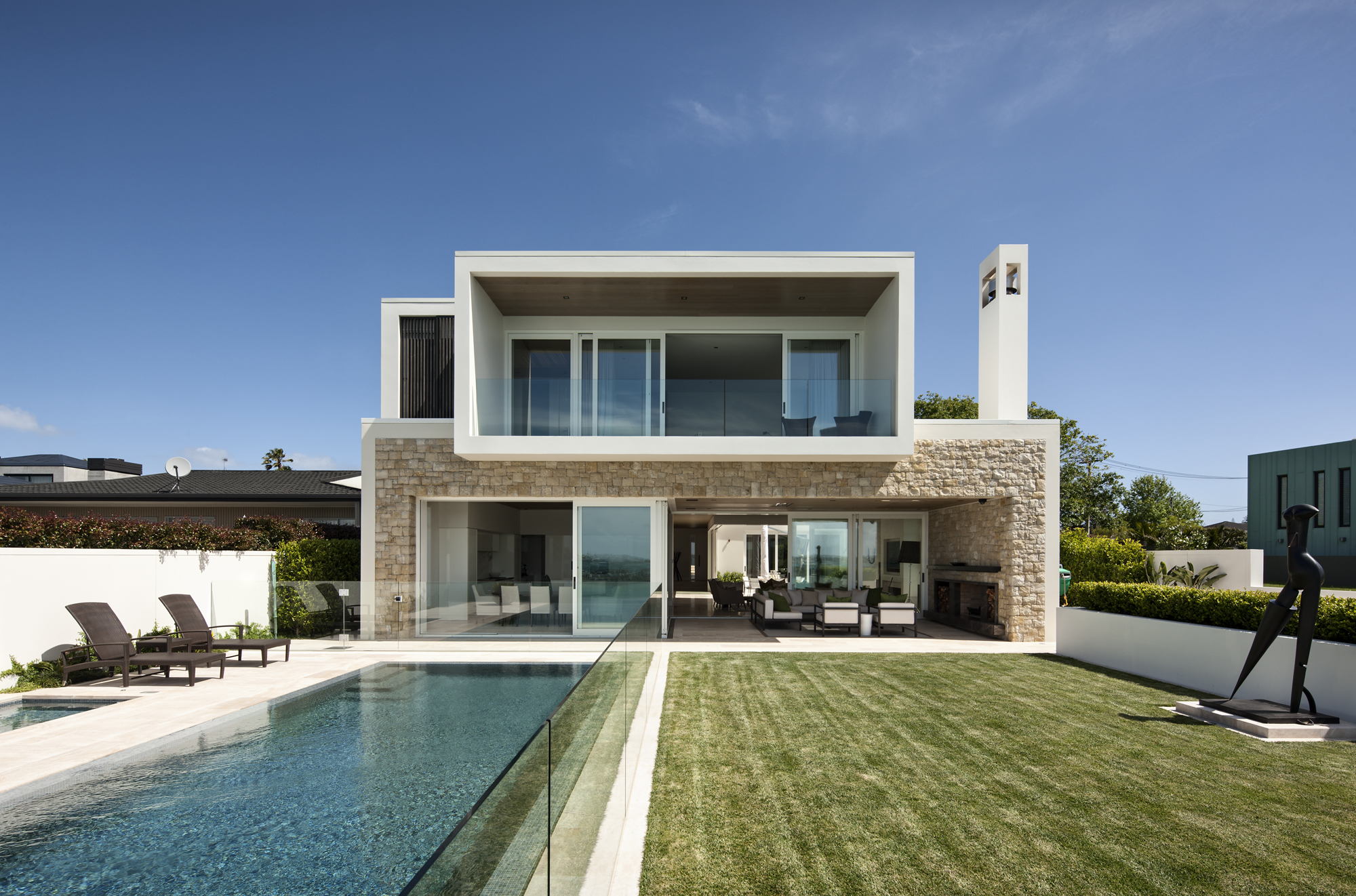 This stunning site in Remuera had a gentle slope down to the cliff. The architect wanted the pool to extend out from the house, enhancing the view. This required reclaiming real estate, a practise we do often. To achieve this we built a palisade wall across the rear of the site (facing the view) comprised of concrete piles with a capping beam and blockwork retaining walls on top. This is then backfilled using Polyrock – a lightweight fill made of polystyrene (earth is too heavy and will cause the cliff to collapse). The pool is piled too (it often surprises people that a pool is lighter than earth). We gained an extension of 11m across the full width of the property.